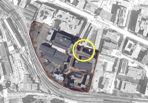 Foreløpig ser det ikke ut til at de har så store planer som naboene i øst der Bryn sentrum skal bygges. Men de har bygget én boligblokk. Merket med gul sirkel over.